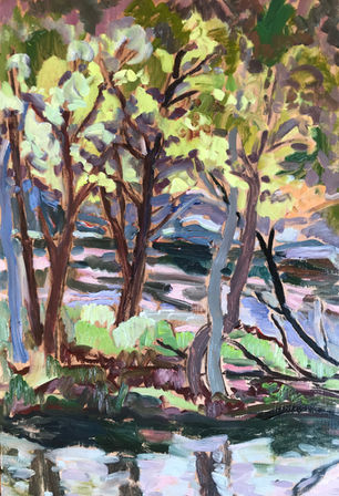 These paintings were inspired by the view outside my studio window. I work in a former textile mill which is adjacent to the Androscoggin River. When the weather is not favorable to working outside, the river and its trees as they respond to changing weather and time of day, become my primary subject matter.